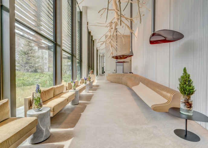 Die endemischen Bäume, die in der Eingangshalle Einzug halten, sind auf poetische Weise sowohl ein Verweis auf die umgebende Pflanzenstruktur als auch auf das durch die Entwurzelung der Erdstreifen freigelegte Wurzelsystem, das die Form des Hotels generiert. Die Formen des Empfangstresens aus Holzschichten erinnern an die Fossilien, die im Jura in großer Zahl vorhanden sind. Als Highlight für Hotelbesucher wird die Bar mit mineralischen Kronleuchtern verschönert, die in völliger Schwerelosigkeit im Raum schweben: ausgehöhlte Berge oder umgestürzte Seen...? Weiter unten, direkt unter der Eingangshalle, geht die Reise weiter in eine neue geologische Schicht: das Restaurant. Riesige Steinblöcke strukturieren den Raum und trennen den Durchgang vom Essbereich. Zwei kieselförmige Bänke unterstreichen das Raumvolumen. Kurzum ist jedes der fünfzig Zimmer des Hotels einzigartig und hat seine eigenen Besonderheiten. Alle Zimmer teilen jedoch eine gemeinsame grafische Identität, die auf den raffinierten Glaswaren basiert, mit denen die Außenwände der Badezimmer bedeckt sind. Alle Fliesen, Spiegel und Glasscheiben wurden so gestaltet, dass sie eine ganz bestimmte Art von Reflexion und Tiefenwahrnehmung bieten. Ein Besuch im Hotel ist ein bisschen wie ein Waldspaziergang, während man ein neues Universum entdeckt...
