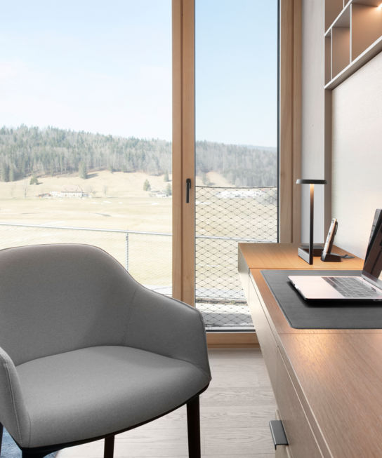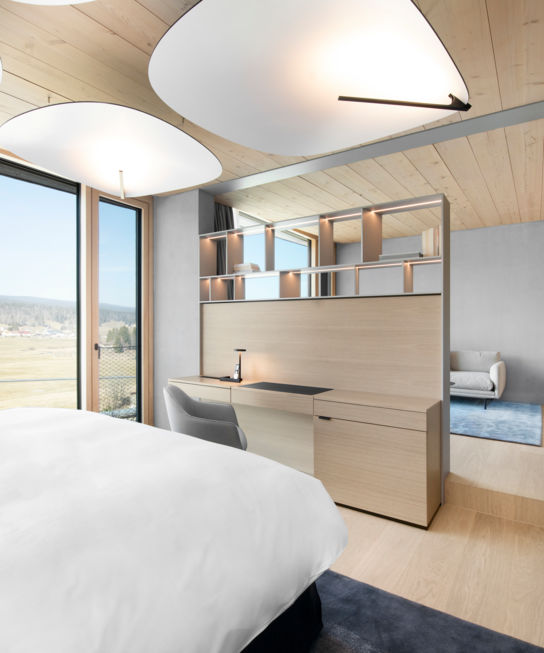 L'élégance et la sophistication sont les mots d'ordre de nos Forest Suites où la nature et le design intemporel sont en parfaite harmonie. Elles vous proposent un espace lumineux grâce à leurs doubles fenêtres vous offrant une vue exceptionnelle sur la Vallée. La Forest Suite offre des équipements uniques tel qu'un bureau séparé, un dressing et des sels de bain relaxants Alpeor® aux senteurs des sapins blancs de la Vallée de Joux. Prenez du temps pour les choses qui comptent.